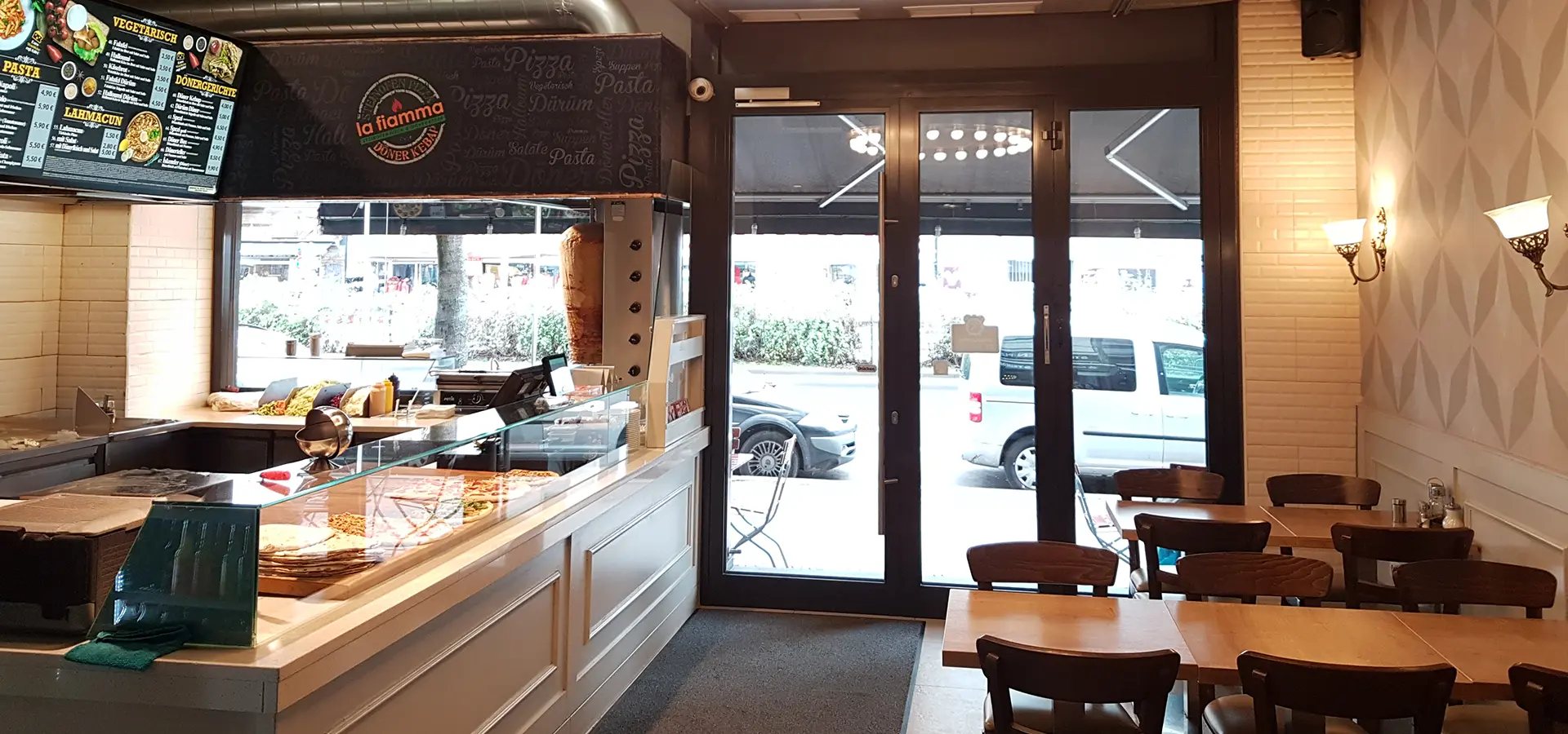 “La Fiamma, als eines der besten türkischen Restaurants in Berlin bekannt, bringt einzigartige Geschmackserlebnisse der türkischen und italienischen Küche mit seinen Kunden zusammen. Wir sprechen die Geschmacksvorlieben unserer Kunden an, indem wir eine breite Palette von Gerichten anbieten, angefangen von verschiedenen Döner Kebap-Variationen über köstliche vegetarische Gerichte bis hin zu herrlichen Pizzen, die im Steinofen gebacken werden, sowie köstlichen Pasta- und Frittieroptionen.”