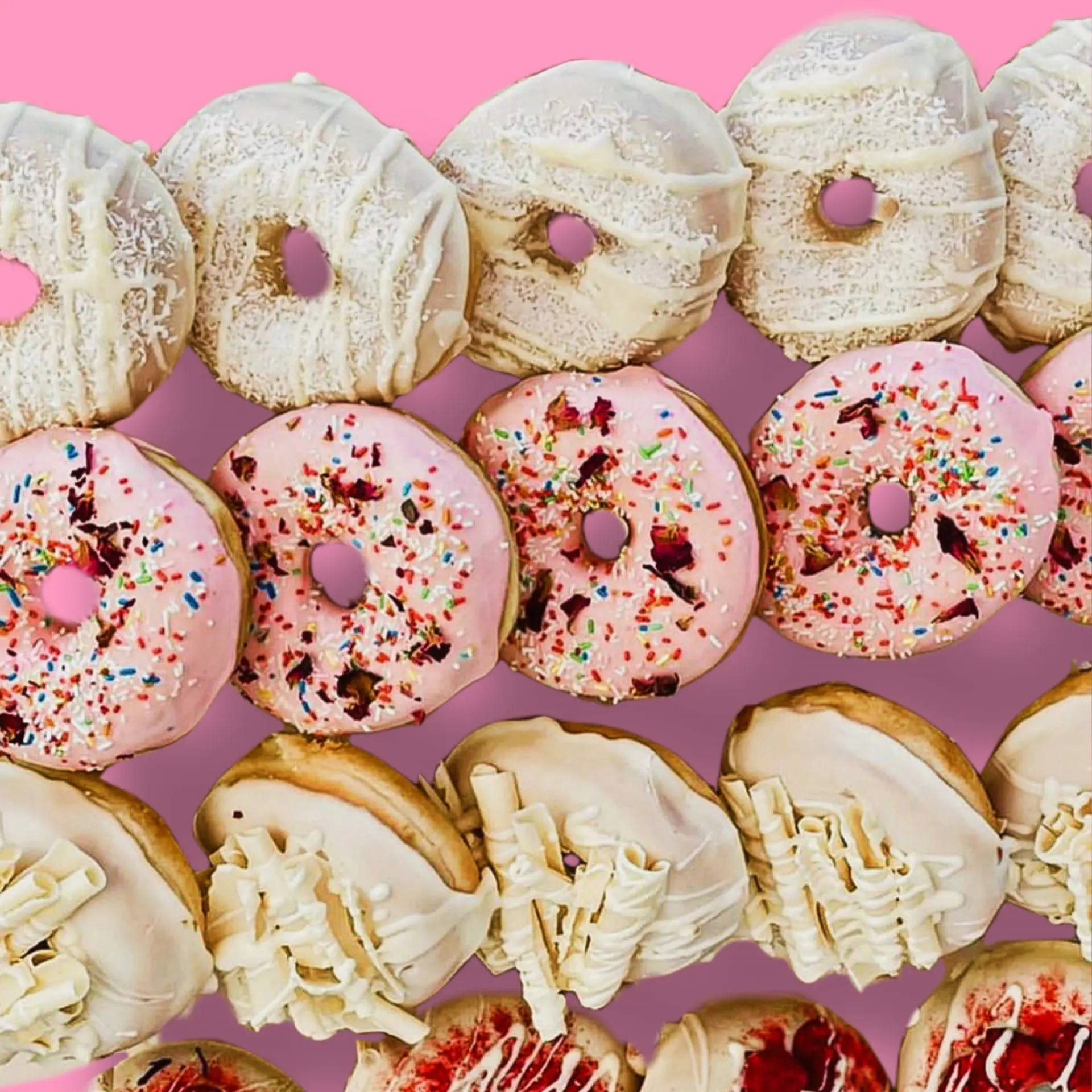 Du kannst Dich einfach nicht entscheiden? Kein Problem! Unsere royalen Überraschungsboxen be-glücken Dich mit sechs zufälligen Donut-Kreationen. Und falls Du dieses Jahr lieber Donuts statt Kuchen auf Deiner Geburtstagsparty haben willst, bekommst Du bei uns eine Donut-Torte aus 20 Donuts mit verschiedenen Toppings.