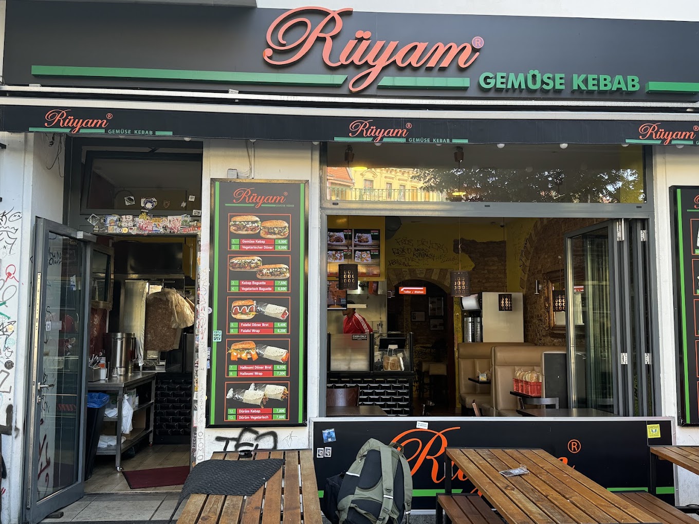 Aus einem Traum , machten wir Wirklichkeit.Rüyam in gemütlicher Atmosphäre mit Gemüse-Kebab, vegetarischem Döner, hausgemachte Falafel,fritiertem Halloumi und treuer Kundschaft verleiht Prenzlauer Berg neuen Glanz.Hier wird nicht nur auf die Qualität geachtet sondern auch auf die Wünsche der Gäste.Die Anrede, das Motto und die Ausstrahlung bei Rüyam ist das A und O. Rüyam gibt dem Gemüse Kebab einen neuen Namen „traumhaft lecker“ wie unser Logo schon beschreibt.Auf Freundlichkeit wird sehr viel Wert gelegt, denn hier handeln echte Gastgeber.